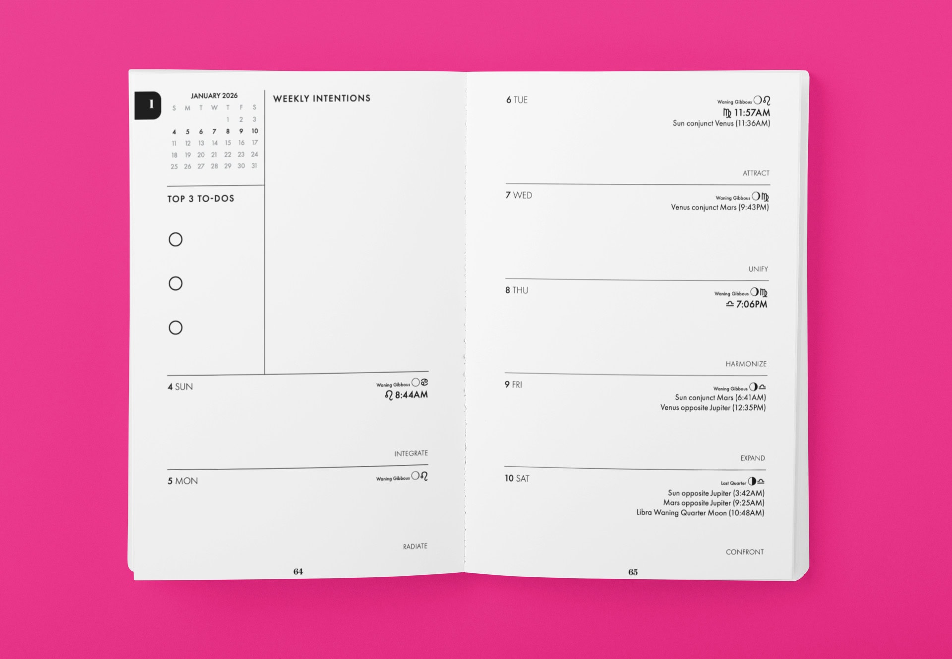 - Daily calendar pages that track the day’s moon phase plus key transits and aspects—with room to write in appointments and events